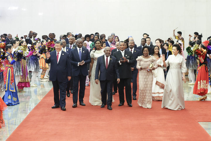 出席论坛峰会的51个非洲国家元首、政府首脑及配偶,2位总统代表,非盟委员会主席和联合国秘书长等贵宾陆续抵达人民大会堂。习近平和彭丽媛热情迎接,同他们分别握手问候,并集体合影留念。