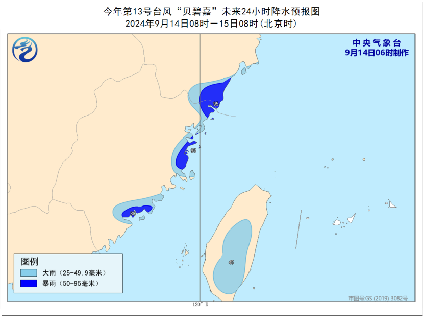 降水预报:9月14日8时至15日8时,浙江东南部、福建东部、台湾岛局地有大到暴雨(25~95毫米)。