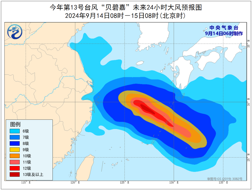 大风预报:9月14日8时至15日8时,东海大部海域、浙江东北部沿海、上海沿海将有6~8级、阵风9~10级的大风,其中东海东北部部分海域将有9~11级、阵风12~13级的大风,“贝碧嘉”中心经过的附近海域或地区风力可达12~13级、阵风14级。