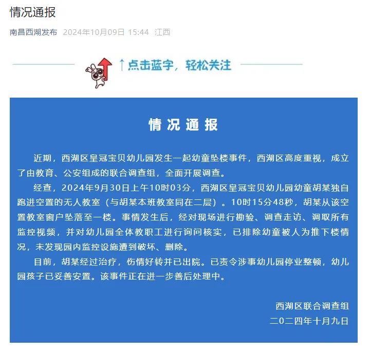 10月9日,“南昌西湖发布”公众号就“西湖区皇冠宝贝幼儿园发生一起幼童坠楼事件”发布情况通报,全文如下: