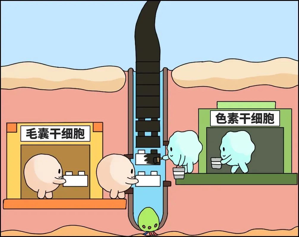 头发变白,说明对应毛囊里的色素干细胞干不动了,给头发上色的“墨”不够了。图源:丁香医生