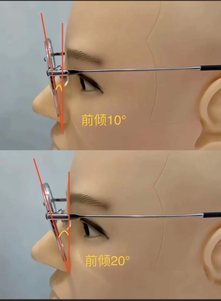 如果镜框前倾角过大,会导致实际产生的光学度数大于镜片设计的度数,导致过矫,引起视疲劳等问题。