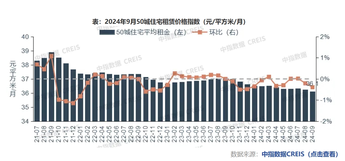 根据中指研究院50城住宅租赁价格指数,2024年三季度50城住宅平均租金下跌0.56%。分月度来看,7月,在毕业季效应支撑下,住房租赁市场保持一定热度,重点城市住房租赁平均租金微幅上涨;8月,随着毕业季效应减退,租赁需求释放节奏放缓,50城租金水平转为小幅下跌;9月50城住宅平均租金为36.1元/平方米/月,环比下跌0.39%,同比下跌2.52%。