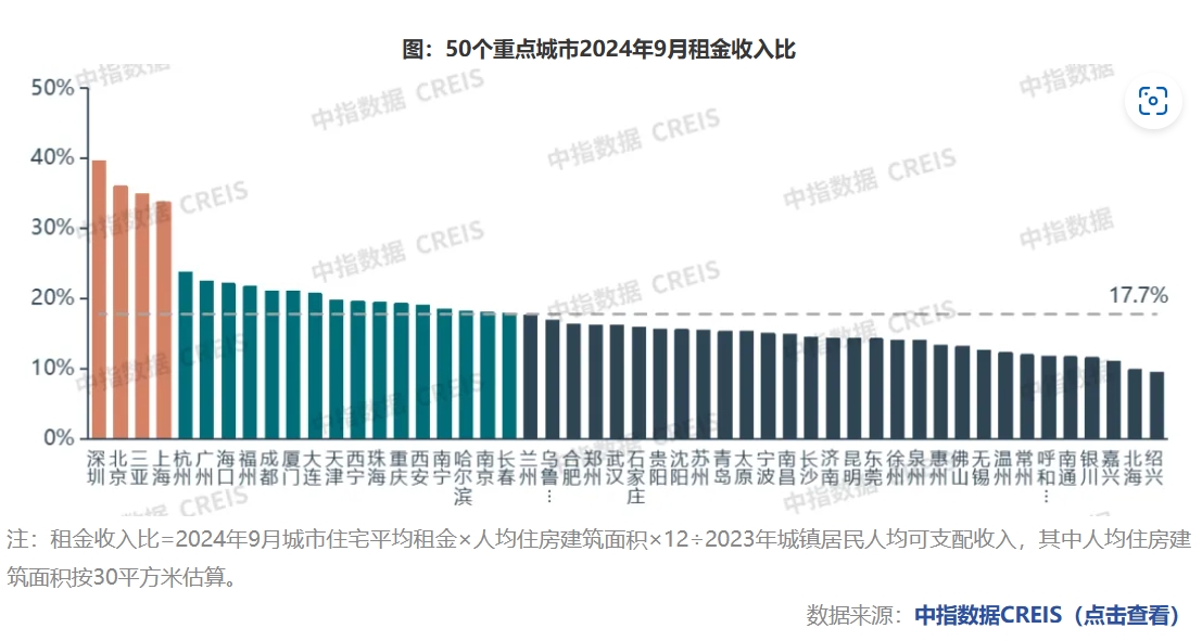 我国重点城市租金收入比整体相对合理。根据中指监测数据,2024年9月,50个重点城市平均租金收入比为17.7%,整体处于合理区间。
