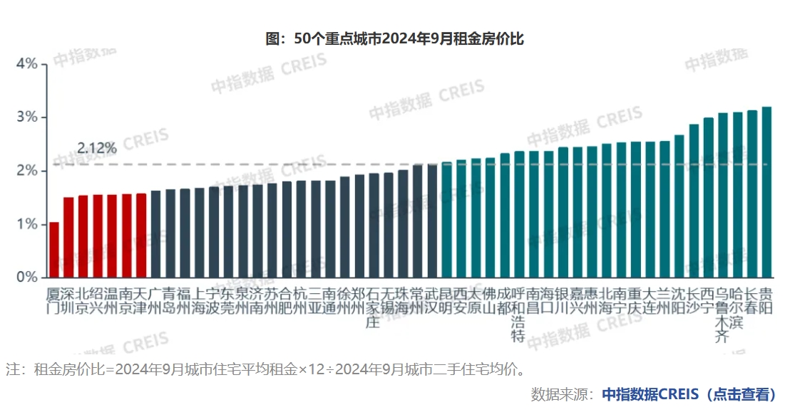 我国重点城市租金房价比低位稳步回升。根据中指监测数据,2024年9月,50个重点城市租金房价比均值为2.12%。