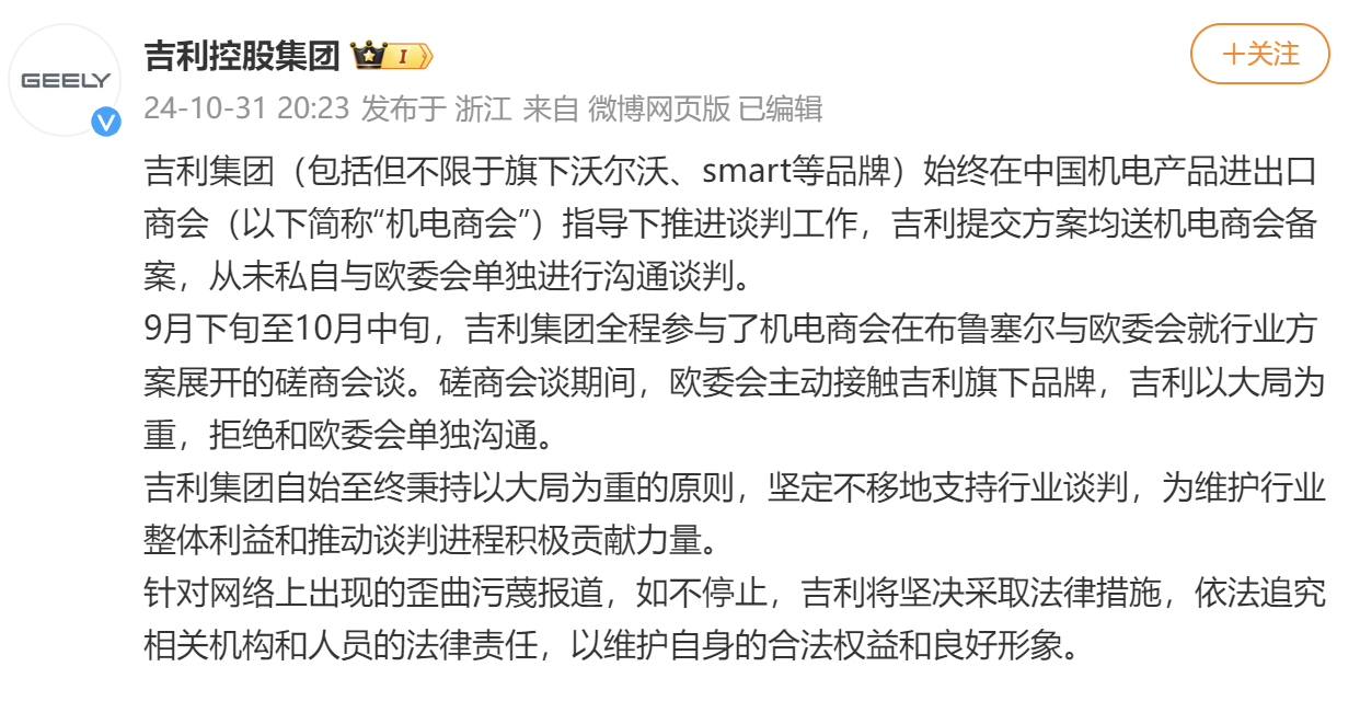 9月下旬至10月中旬,吉利集团全程参与了机电商会在布鲁塞尔与欧委会就行业方案展开的磋商会谈。磋商会谈期间,欧委会主动接触吉利旗下品牌,吉利以大局为重,拒绝和欧委会单独沟通。