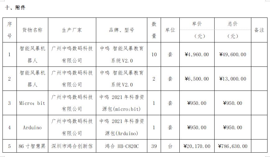 此外,记者在云南省政府采购网查询到一份《富宁县第一中学智慧黑板和教学设备采购项目中标结果公告》。公告于2023年1月5日发布,中标供应商为云南田园科技有限公司,金额为91.9万元。标的信息中,有广州中鸣数码科技有限公司生产的智能风暴机器人12套、 2021年科普资源包2套,合计金额达64500元。