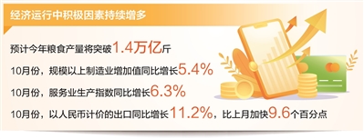 从需求看,“两重”(国家重大战略实施和重点领域安全能力建设)、“两新”(大规模设备更新和消费品以旧换新)政策持续发力,不断释放消费潜力、拉动投资增长。10月份,基础设施投资、制造业投资、社会消费品零售总额增速都有所加快,以人民币计价的出口同比增长11.2%,比上月加快9.6个百分点。