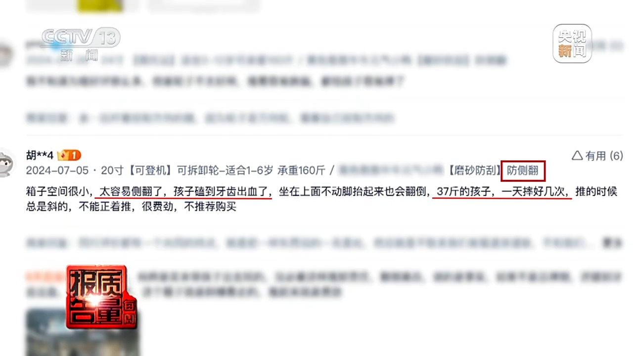记者看到网上有不少消费者的投诉,这个儿童骑行箱产品尽管声称“防侧翻”,消费者留言却显示“太容易侧翻了,孩子磕到牙齿出血了,37斤的孩子,一天摔好几次”。常见的质量问题投诉主要还有轮子不灵活、拉杆有点单薄、容易翻车、不是很稳定等。