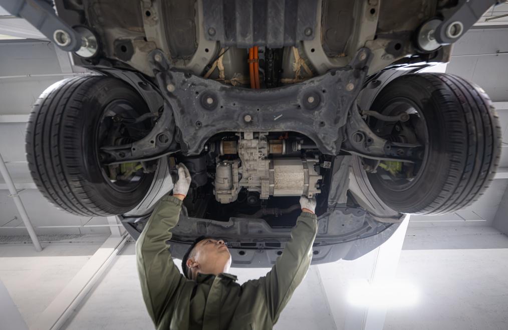 12月5日,一名新能源汽车维修师在检查一辆新能源汽车的电机。新华社记者 肖艺九 摄