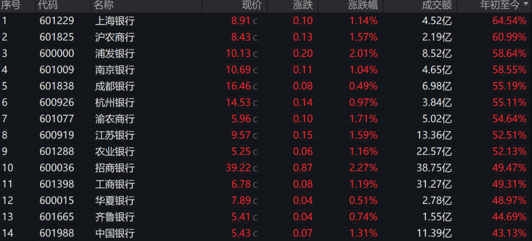 Wind数据显示,年初至今,A股市场银行板块整体涨幅达42.18%,在35个Wind二级行业中排第一位。其中,上海银行以64.54%的涨幅居首,沪农商行涨幅也超60%,浦发银行、南京银行、成都银行、杭州银行、渝农商行、江苏银行、农业银行共7只个股股价涨幅超50%;招商银行、工商银行、华夏银行、中国银行、建设银行、交通银行等10只股票涨幅超40%;仅郑州银行和兰州银行涨幅为个位数,分别涨5.97%、1.14%。