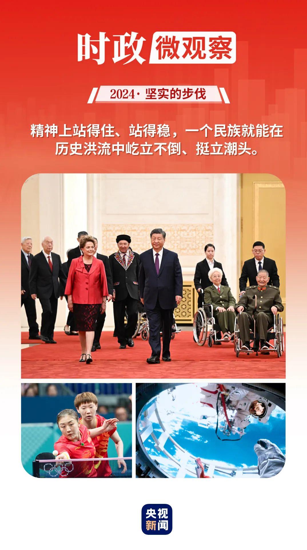 回望2024年,党的二十届三中全会标记下改革开放进程又一重要历史性时刻;我们热烈庆祝中华人民共和国成立75周年 、澳门回归祖国25周年,汇聚砥砺前行的强大力量;中国体育代表团取得夏季奥运会境外参赛最好成绩,生动诠释了新时代中国精神;太空遨游、智能迭代、长桥飞渡、巨轮启航,中国的创新动力、发展活力勃发奔涌……中国人民更加自信自强,奋斗精神更加昂扬。