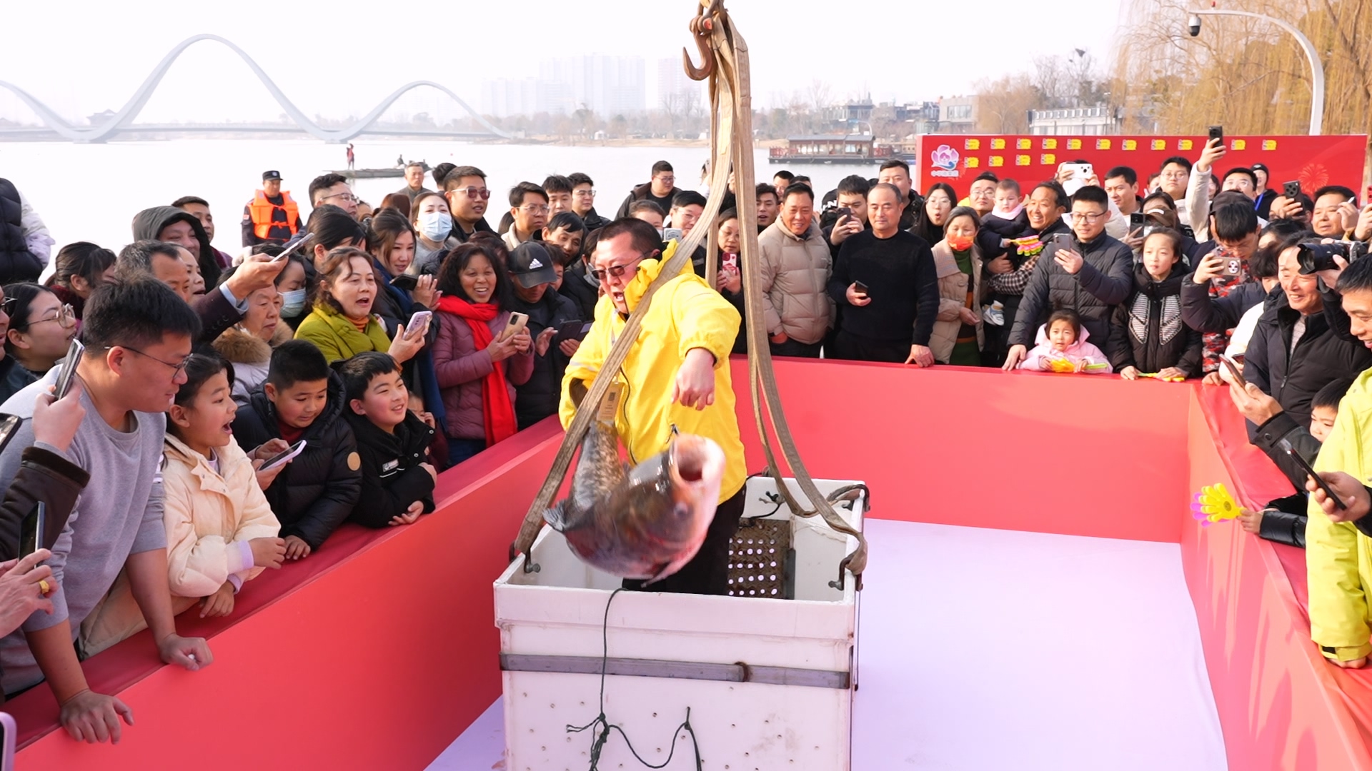 “开网打鱼哟……打出了头鱼心欢喜噢!打出了幸福万年长!”1月21日下午3时8分,一声锣响,中华海棠园首届冬捕活动开启,波光粼粼的湖面上泛起涟漪。伴随着起重机的轰鸣,一网网肥硕鱼儿露出水面,浪花四溅。“出鱼啦!”站在湖边的众多市民欢呼起来。