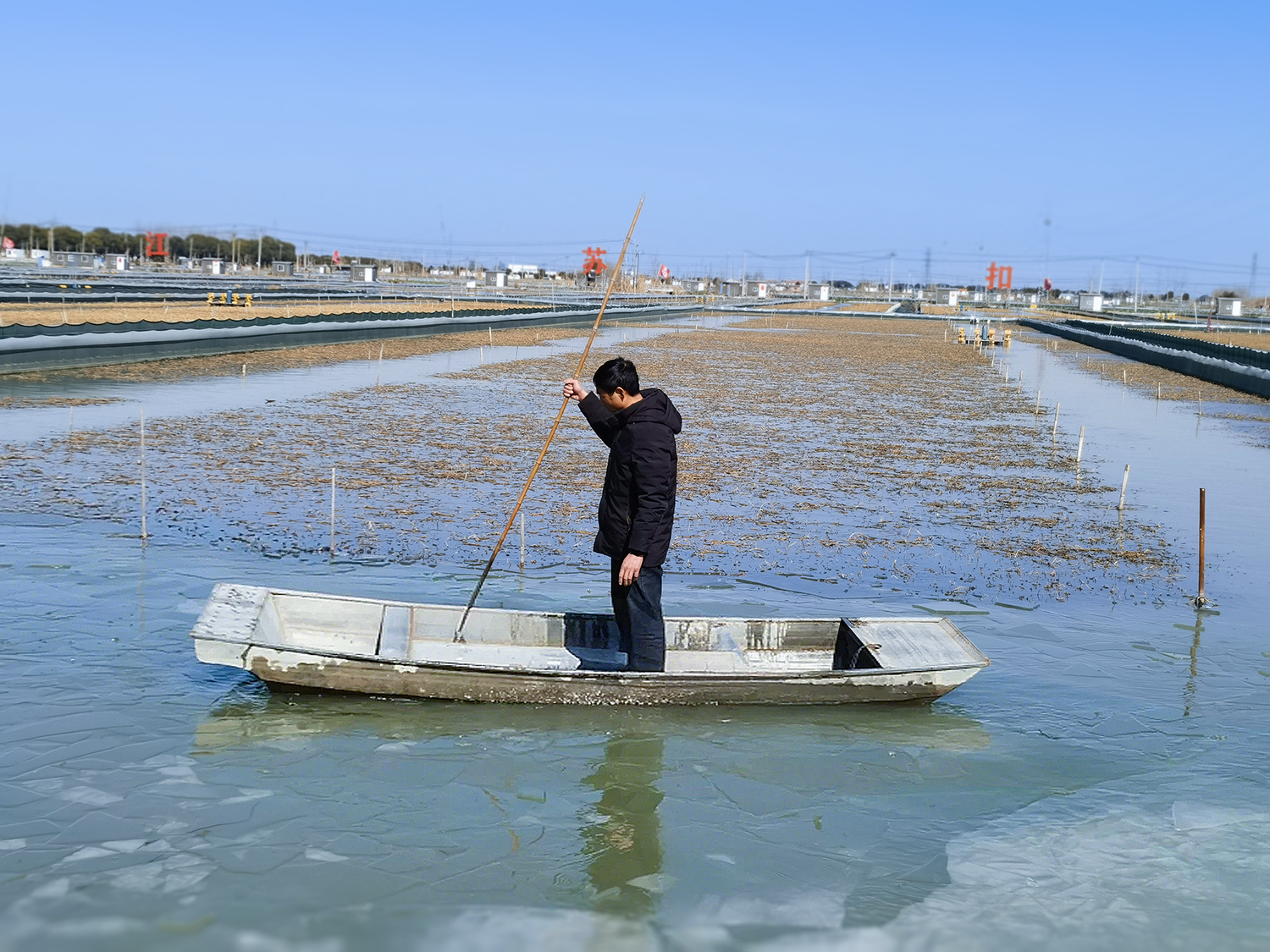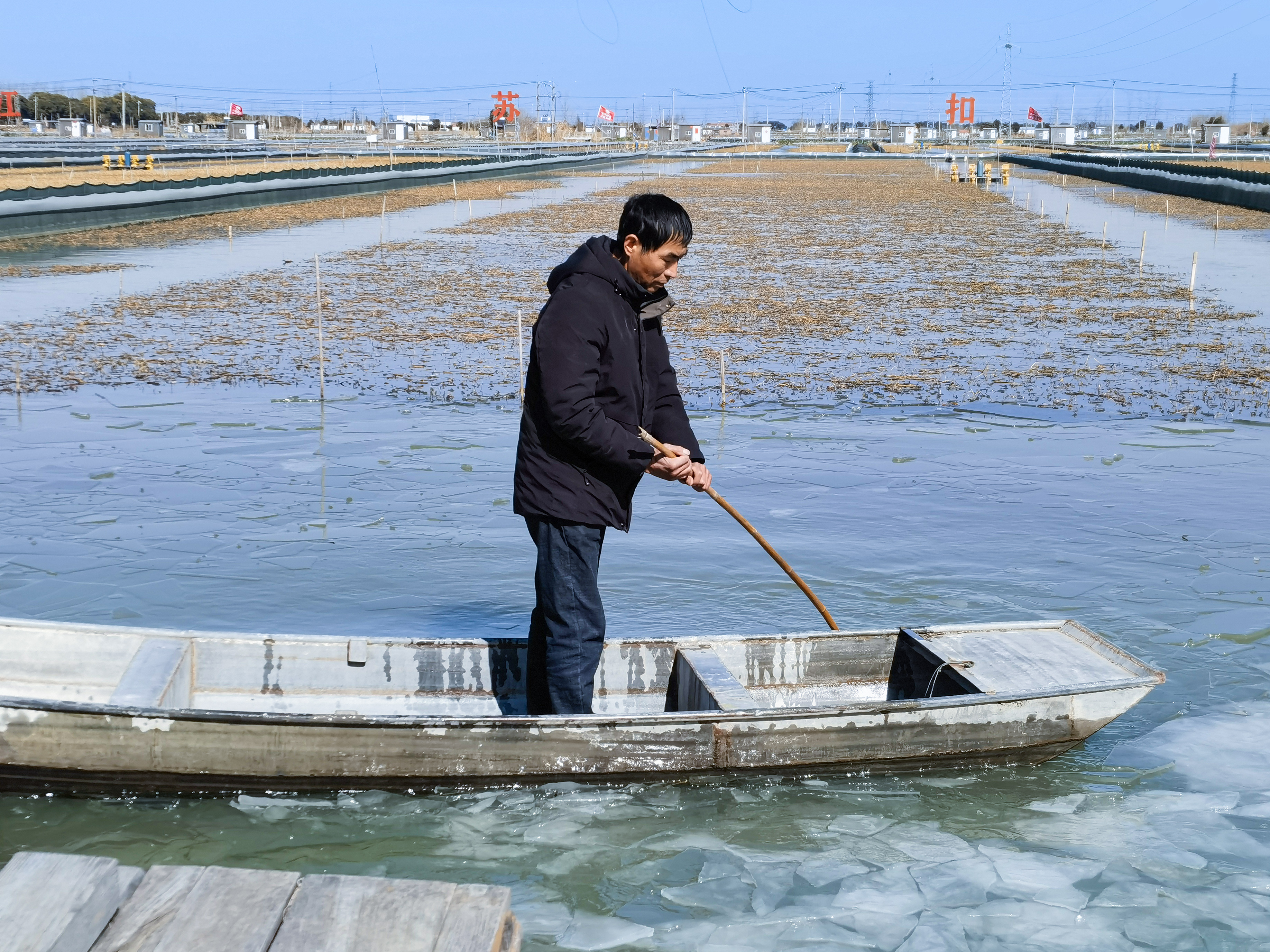 “咔嚓——”船头破开冰面,细碎的冰碴在阳光下折射出七彩光晕。蟹农徐正东撑起竹篙,载着小船在冰封的蟹塘里划开一道裂痕。零下7℃的严寒里,这位朴实的庄稼汉笑道:“冰层冻得结实,要及时破冰增氧。”2月8日上午的盐都区大纵湖镇兴湖社区扣蟹基地,1400多亩蟹塘凝结成一面面冰镜,一只只扣蟹正安静地蛰伏在水花生草下面等待收获的那刻。