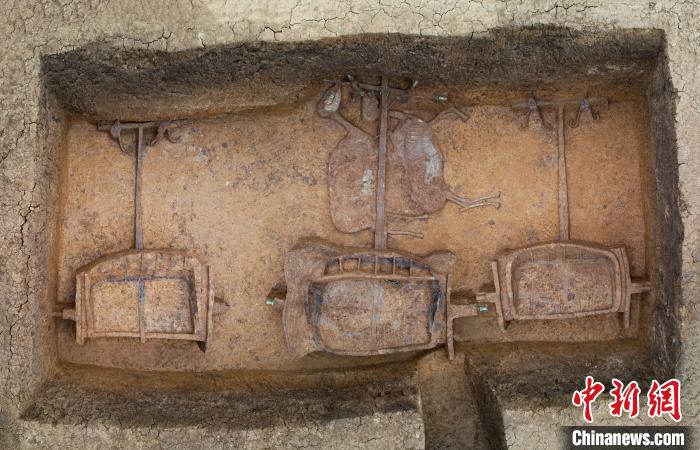 车马埋葬制度是中国古代丧葬文化中重要的礼仪制度之一,流行于商周至秦汉时期。车马埋葬一般与墓葬有关,多作为墓葬的附属设施。胡刚介绍,其内容包括具有象征意义的车马出行、战车列阵、马厩等,又分为墓葬外或墓葬内两种表现形式。