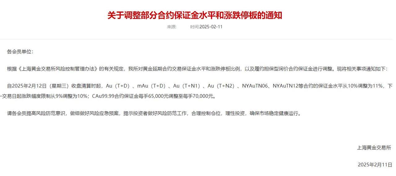 具体来看,《通知》称,自2025年2月12日(星期三)收盘清算时起,Au(T+D)、mAu(T+D)、Au(T+N1)、Au(T+N2)、NYAuTN06、NYAuTN12等合约的保证金水平从10%调整为11%,下一交易日起涨跌幅度限制从9%调整为10%;CAu99.99合约保证金每手65000元调整至每手70000元。
