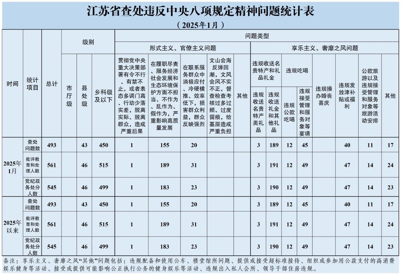 江苏省纪委监委2月27日通报:2025年1月,全省共查处违反中央八项规定精神问题493起,批评教育和处理561人、其中给予党纪政务处分545人。从问题类型看,查处形式主义、官僚主义问题176起、批评教育和处理221人,查处享乐主义、奢靡之风问题317起、批评教育和处理340人。从人员级别看,批评教育和处理县处级干部46人、乡科级及以下人员515人。