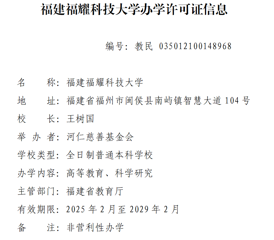 《福建省人民政府关于申请设置福耀科技大学的函》(闽政函〔2024〕48号)和《福建省教育厅关于将拟设置新型研究型大学校名调整为福建福耀科技大学的请示》(闽教发〔2025〕1号)收悉。根据《中华人民共和国高等教育法》《中华人民共和国民办教育促进法》《中华人民共和国民办教育促进法实施条例》《普通高等学校设置暂行条例》有关规定以及第八届全国高等学校设置评议委员会评议结果,经教育部党组会议研究决定,同意设置福建福耀科技大学,学校标识码为4135014896。现将有关事项函告如下。