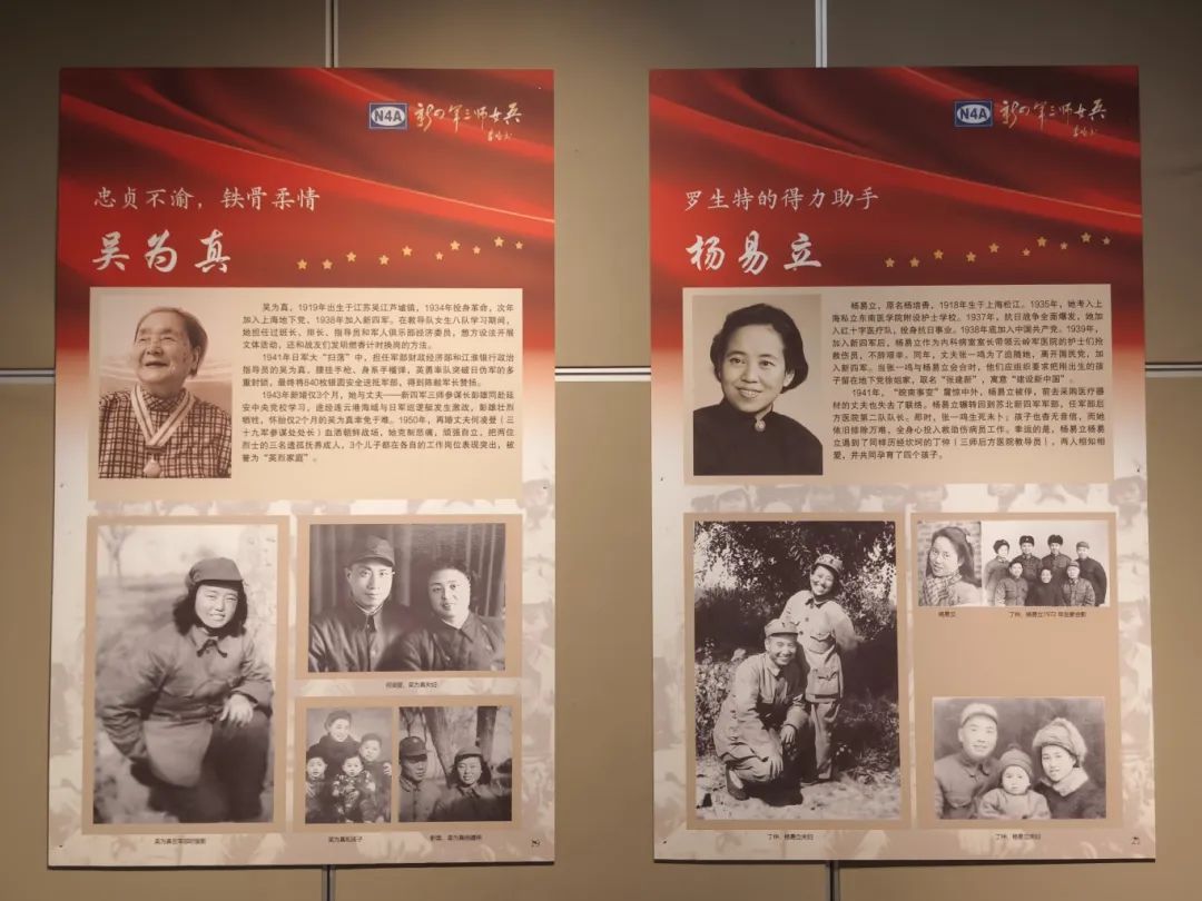 吴为真是新四军三师女兵的杰出代表。本次展览中,有一幅专门介绍她事迹的展板。1943年春,彭雄率队搭乘木帆船取海路北上山东解放区,再转道赴延安学习,新婚妻子吴为真随同前往。行至连云港以北海面时忽然同日军遭遇,激战中彭雄腿部、胸部多处中弹,伤势严重,壮烈殉国。已怀有两个月身孕的吴为真幸免于难。彭雄牺牲后,吴为真为英烈诞下遗腹子彭小雄。