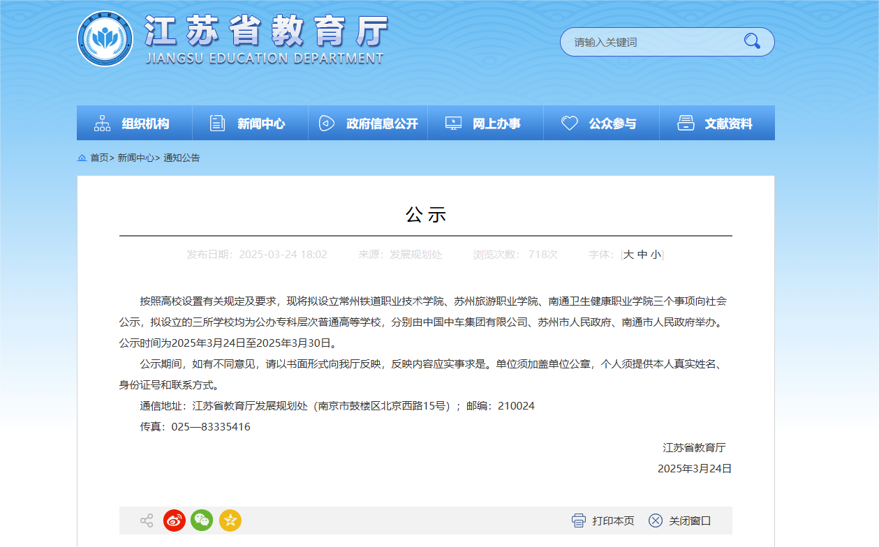 交汇点讯 3月24日,江苏省教育厅发布公示:按照高校设置有关规定及要求,现将拟设立常州铁道职业技术学院、苏州旅游职业学院、南通卫生健康职业学院三个事项向社会公示,拟设立的三所学校均为公办专科层次普通高等学校,分别由中国中车集团有限公司、苏州市人民政府、南通市人民政府举办。公示时间为2025年3月24日至2025年3月30日。