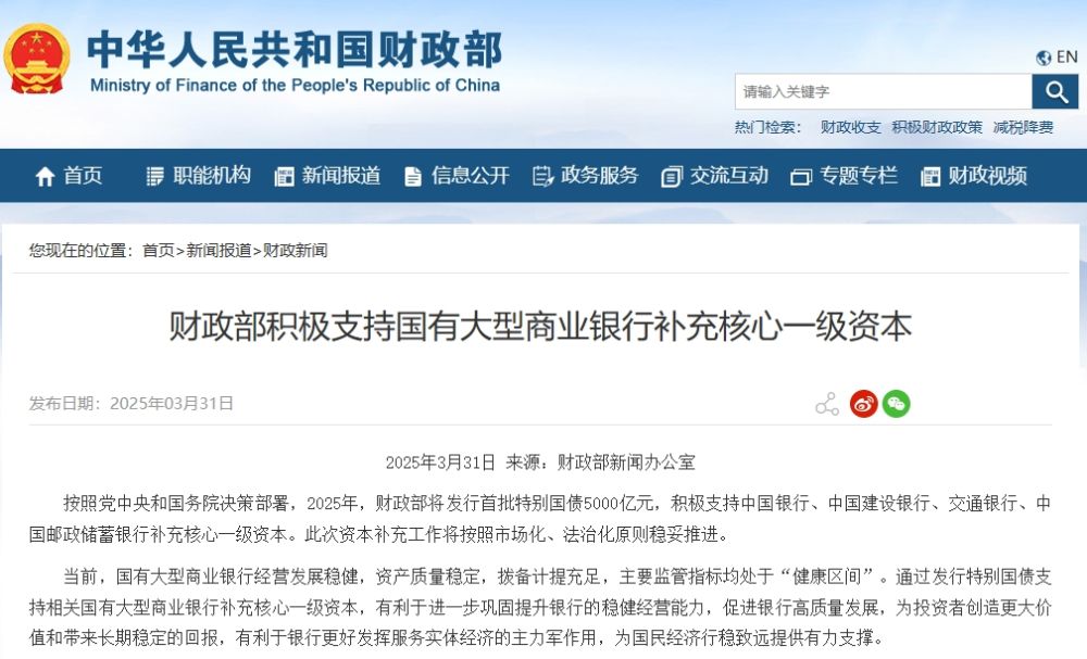 按照党中央和国务院决策部署,2025年,财政部将发行首批特别国债5000亿元,积极支持中国银行、中国建设银行、交通银行、中国邮政储蓄银行补充核心一级资本。此次资本补充工作将按照市场化、法治化原则稳妥推进。