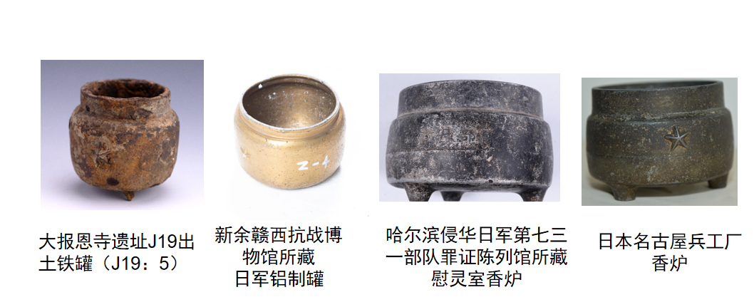 这3只铁罐形制特殊,它们究竟是做什么用的呢?张子怡表示它们可能是侵华日军举行“慰灵”活动的香炉。她在搜集资料时发现,哈尔滨侵华日军第七三一部队罪证陈列馆有一件同类器物,经日方鉴定,确定原为日军“慰灵室”所用香炉。侵华日军为追悼阵亡日本士兵、慰藉所谓的“英灵”及遗族,往往设立“慰灵室”、举办“慰灵祭”。