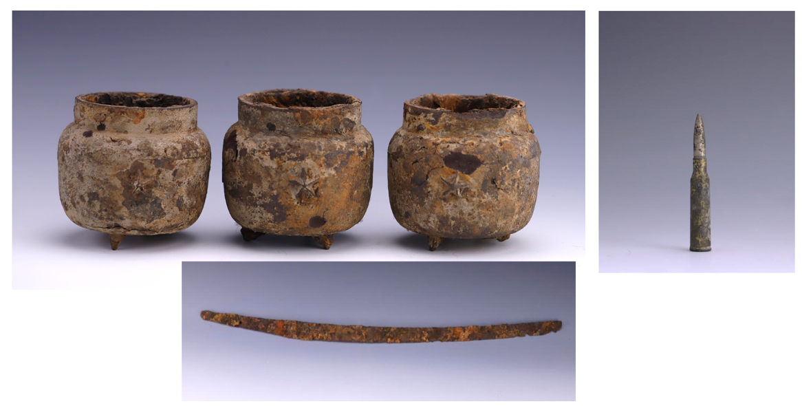 其中,3只铁罐的腹部两侧对称装饰着五角星图案。张子怡告诉记者,日本陆军把五角星作为标志,侵华日军的军服、头盔上均有五角星。经与侵华日军第七三一部队罪证陈列馆等多地同类器物比对,考古人员确认这3只铁罐出自侵华日军。
