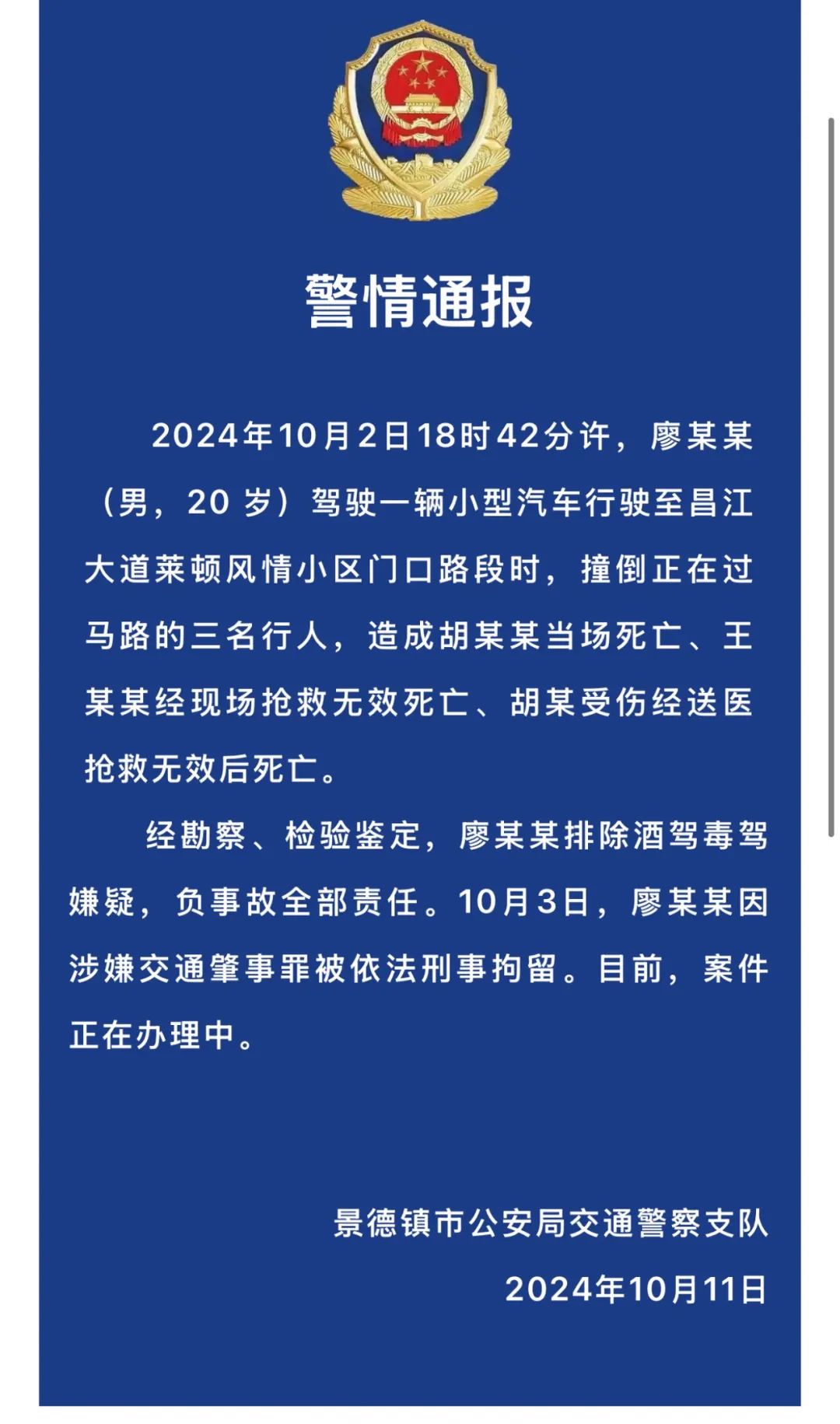 据景德镇市公安局交通警察支队此前发布的警情通报:2024年10月2日18时42分许,廖某某(男,20 岁)驾驶一辆小型汽车行驶至昌江大道莱顿风情小区门口路段时,撞倒正在过马路的三名行人,造成胡某某当场死亡、王某某经现场抢救无效死亡、胡某受伤经送医抢救无效后死亡。经勘察、检验鉴定,廖某某排除酒驾毒驾嫌疑,负事故全部责任。10月3日,廖某某因涉嫌交通肇事罪被依法刑事拘留。