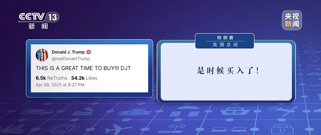 据美国媒体报道称,特朗普在暂缓加征关税决定公布前差不多3小时,也就是美股开盘后不久通过社交媒体发文称:“现在是买入的绝佳时机!DJT。”