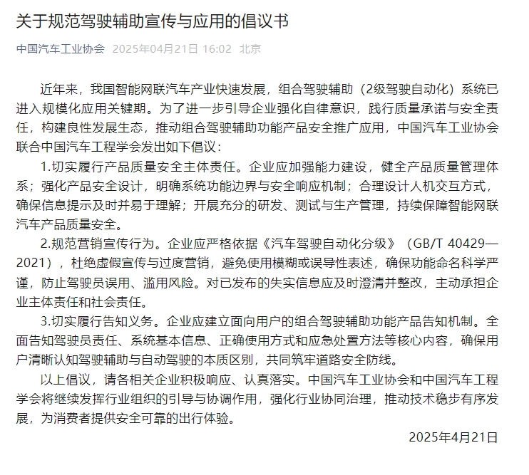 以上倡议,请各相关企业积极响应、认真落实。中国汽车工业协会和中国汽车工程学会将继续发挥行业组织的引导与协调作用,强化行业协同治理,推动技术稳步有序发展,为消费者提供安全可靠的出行体验。