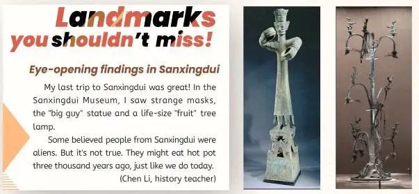 又比如,围绕“中国主要城市及家乡的地理位置和自然环境”主题内容,人教版三年级上册的教材中出现了一个全新的教学单元《Amazing Landmarks》(惊人的地标)。在这个单元中,从对话板块的长城、兵马俑,到词汇板块的故宫、港珠澳大桥、黄鹤楼、泰山,再到阅读板块的井冈山旅游网站评论,都潜移默化地帮助学生在学习语言的同时,共同游历祖国的大好河山。
