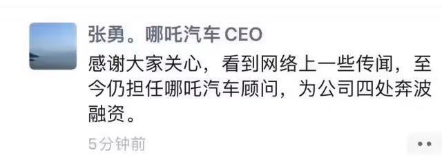 4月14日,哪吒汽车原CEO张勇发朋友圈回应“身在英国传闻”称:“感谢大家关心,看到网络上一些传闻,至今仍担任哪吒汽车顾问,为公司四处奔波融资。”