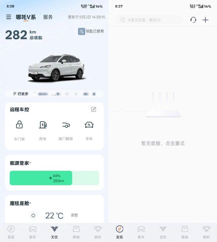哪吒汽车App目前出现“网络异常”,车联网数据已停止更新,车辆远程操控等功能无法使用,首页“发现”栏目显示为“暂无数据,点击重试”,如果用户尝试重新登录App时会出现“HTTP 502 Bad Gateway”错误提示。