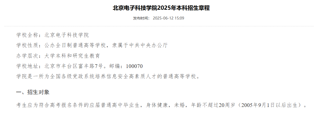 北京电子科技学院2025年本科招生章程指出,招生对象明确指出:考生应为符合高考报名条件的应届普通高中毕业生,身体健康,未婚,年龄不超过20周岁(2005年9月1日以后出生)。