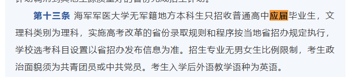 海军军医大学2025年无军籍地方本科生招生章程中明确:海军军医大学无军籍地方本科生只招收普通高中应届毕业生,文理科类别为理科,实施高考改革的省份录取规则和程序按当地省招办规定执行,学校选考科目设置以省招办发布信息为准。招生专业无男女生比例限制,考生政治面貌须为共青团员或中共党员。考生入学后外语教学语种为英语。