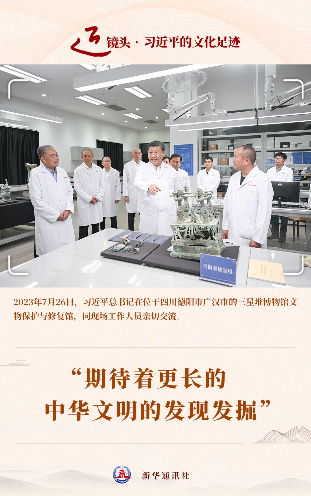 “总书记在三星堆新一轮考古发掘出土的青铜神坛底座前驻足端详,询问起这件繁复精美器物的修复过程。我告诉总书记,修复这件器物至少得一年,总书记感叹‘这个工作不容易!’,勉励我们发扬慢工出细活的精神,慢慢来,久久为功,搞成一件是一件。”郭汉中说。