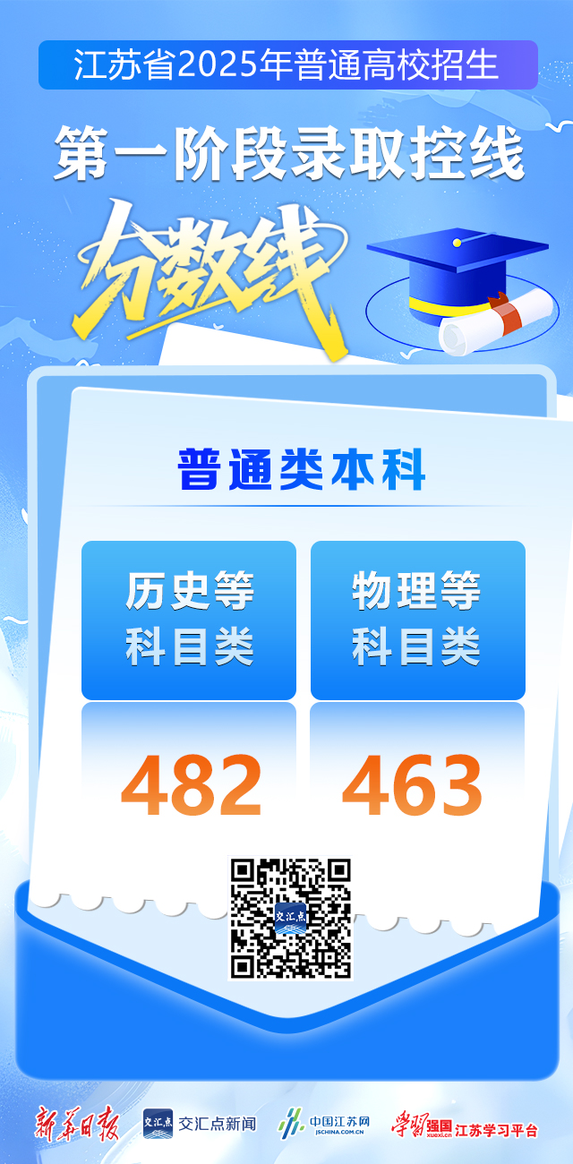 江苏省普通类本科历史等科目类分数线482分,物理等科目类分数线463分。