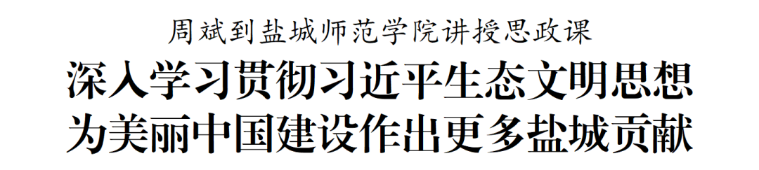 6月25日,市委书记周斌到盐城师范学院讲授思政课,围绕深刻领悟习近平生态文明思想的丰富内涵、盐城推进生态文明建设的生动实践,与青年学生交流,希望大家牢记习近平总书记殷殷嘱托,努力成为可堪大用、能担重任的栋梁之才,积极投身生态环境保护、现代化建设和高质量发展,为美丽中国建设作出更多盐城贡献。