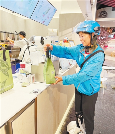 杭州饿了么骑手黄晓琴在取餐。林移涵摄