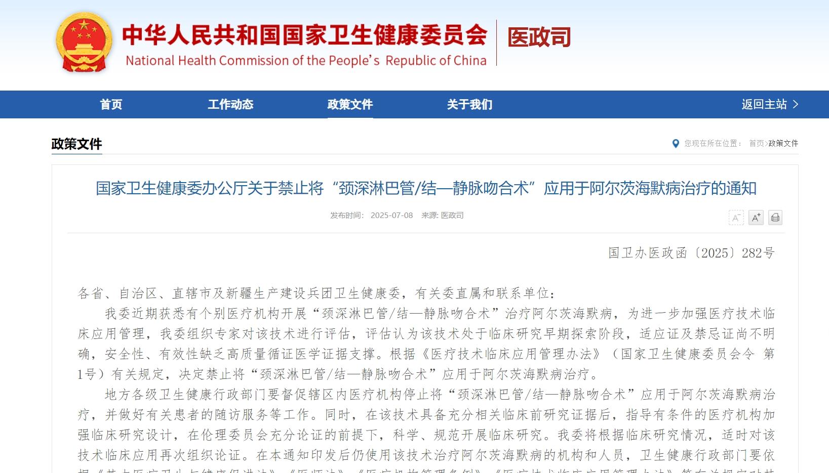 7月8日,国家卫健委网站发布两份通知,禁止将“颈深淋巴管/结—静脉吻合术”(LVA)应用于阿尔茨海默病(AD)治疗,禁止将“空肠回肠吻合术”应用于2型糖尿病治疗。