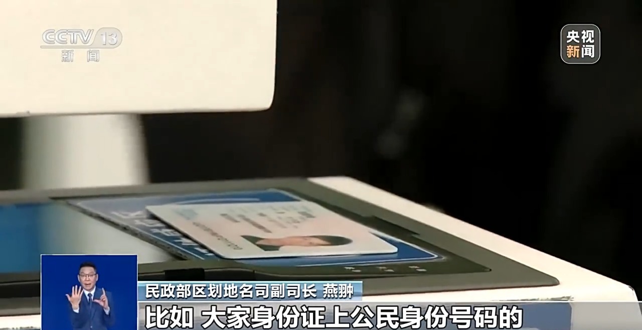 民政部区划地名司副司长 燕翀:政府部门、企事业单位的信息管理系统中基本都要使用行政区划代码,很多重要领域的数字代码都是以行政区划代码作为基础来编码的。比如,大家身份证上居民身份证号码的前六位就是行政区划代码,行政区划代码也是统一社会信用代码的重要基础码段。