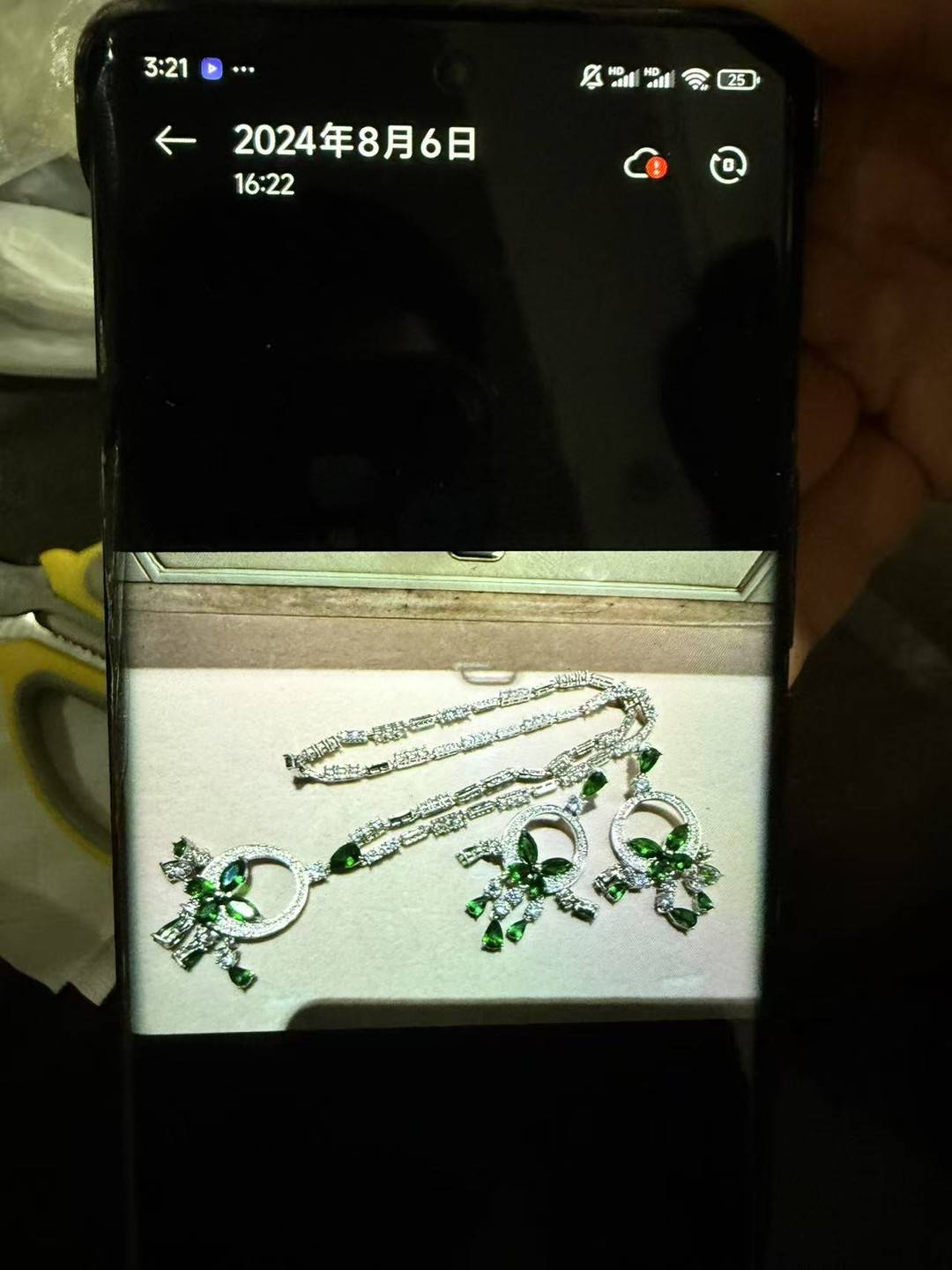 刘芳芳回忆,2016年前后,她去深圳,在水贝珠宝市场逛街时,买下了这套饰品。这套饰品是三件套,一对耳环和一条项链。据司玲霞于2024年8月6日用手机拍摄的图片证实,这套饰品确系三件套。
