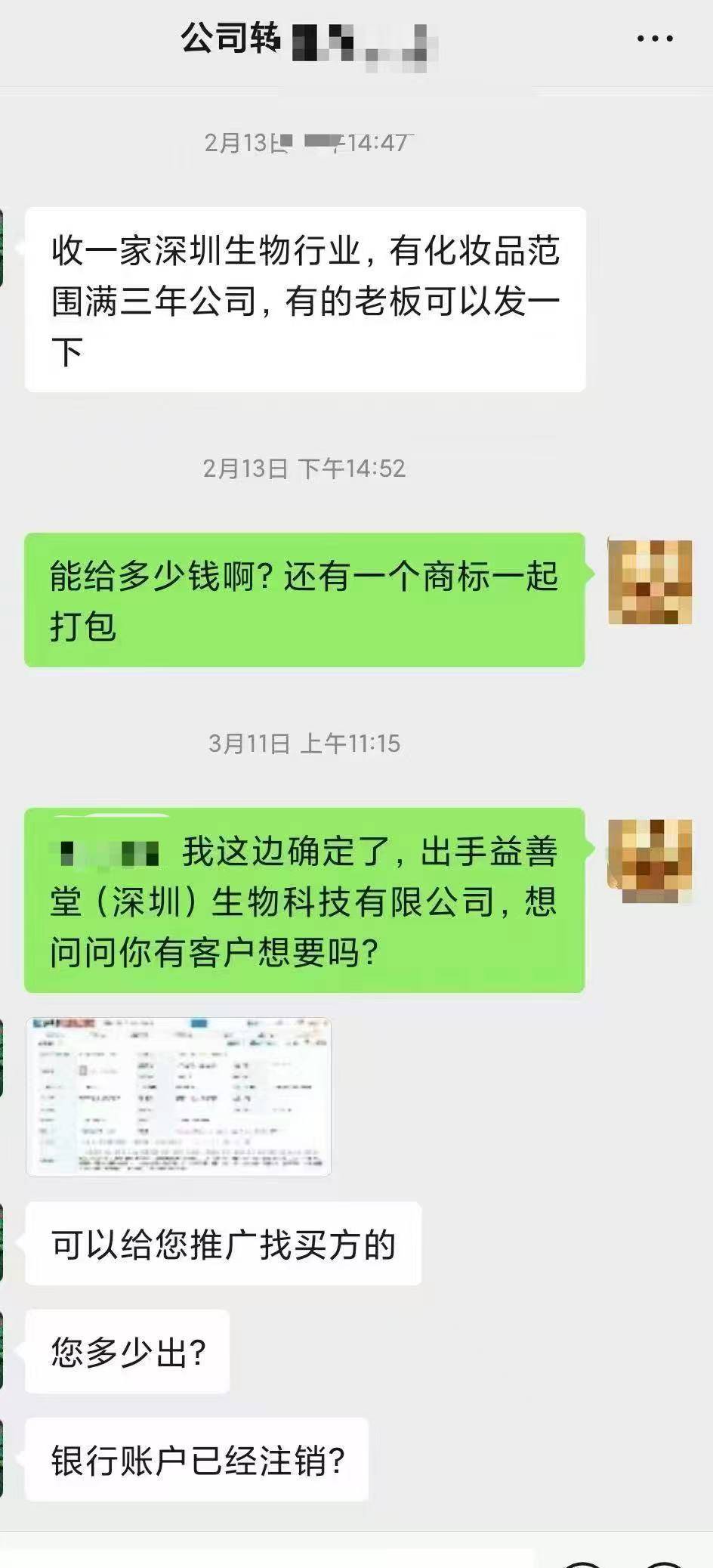 杨伟与转让中介的聊天记录显示,2024年5月16日,杨伟提出转让公司。2025年3月11日,杨伟“确定出手名下公司”,中介回复“商标带着公司一起转的话2600元”。3月19日,双方签订《股权确认居间服务协议》后,中介通过微信转账,向杨伟支付了1300元定金。最终于5月14日完成公司转让。