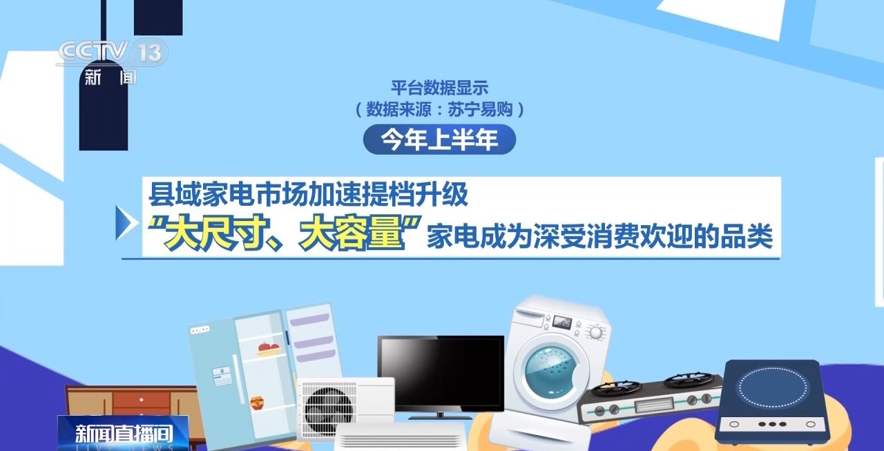 平台数据显示,今年上半年,县域家电市场加速提档升级,“大尺寸、大容量”家电成为深受消费者欢迎的品类。据统计,98英寸以上大屏电视销售同比增长43%,搭载净味除菌功能的550L以上大容量冰箱销售同比增长89%。“智能化”家电也成为市场新宠。上半年,5000元以上空调中,AI产品销量占比超60%,智能烟灶套装、扫地机器人销量同比分别增长76.7%、92.5%。