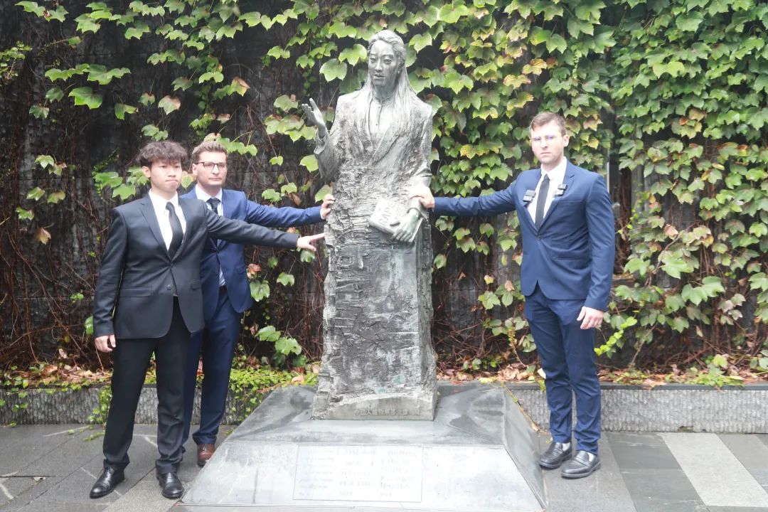 在张纯如铜像旁,马库斯和好友俯身伸出双手,轻轻覆在铜像的手臂上。三人凝视着张纯如铜像的面容说:“张纯如是我们的偶像。”