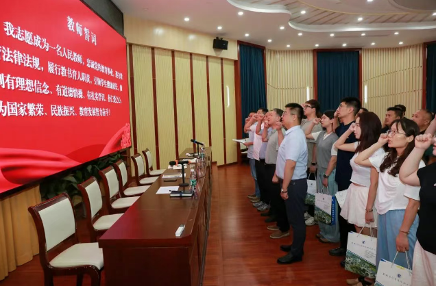 会议最后,沈子俊书记带领全体参会人员庄严宣誓,铿锵有力的誓言回荡在报告厅内,彰显着全体教师立德树人的坚定决心。