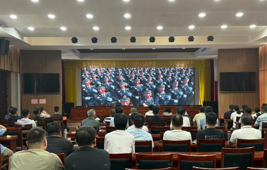 在大纵湖旅游度假区会议室,度假区管理办公室班子成员和各部门负责人收看了阅兵式电视直播。