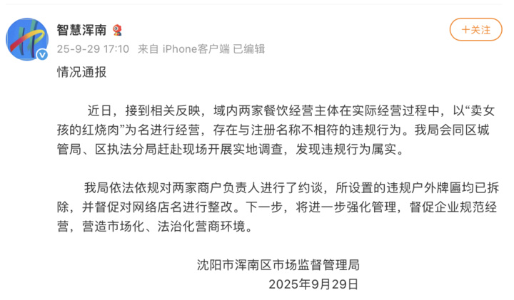 29日,沈阳浑南区通报“‘卖女孩的红烧肉’餐馆店名争议”:违规行为属实,约谈两家商户负责人,督促整改店名。详情如下: