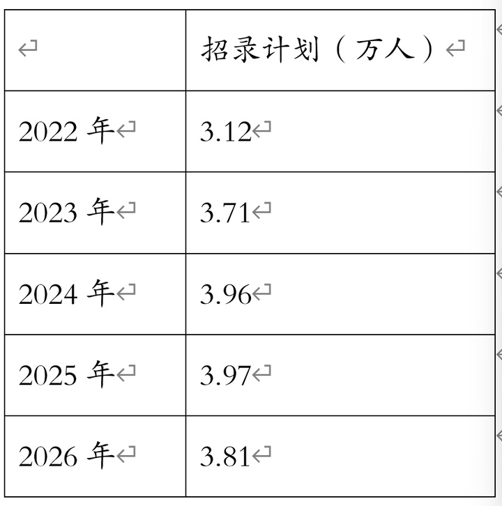 根据国家公务员局网站发布的《中央机关及其直属机构2026年度考试录用公务员公告》,本次共计招生3.81万人,较去年减少了约1600人。此前几年,国家公务员考试的招录人数一直呈现扩大趋势,从2019年的1.45万人,逐年增长到2025年的3.97万人,本次招录规模才出现小幅度缩减。