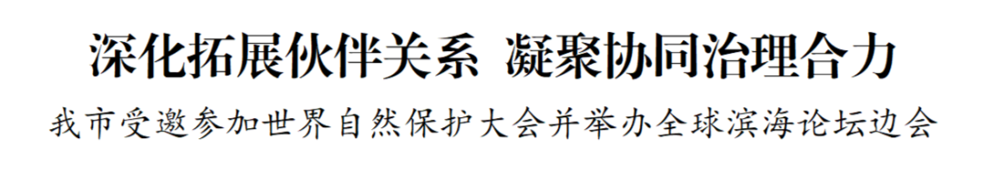 会议介绍了IUCN全球决议——《促进多边承诺的协同执行以保护滨海生态系统》内容,分享了全球滨海论坛两项科学成果,我市和世界自然保护联盟作了最佳实践案例分享。